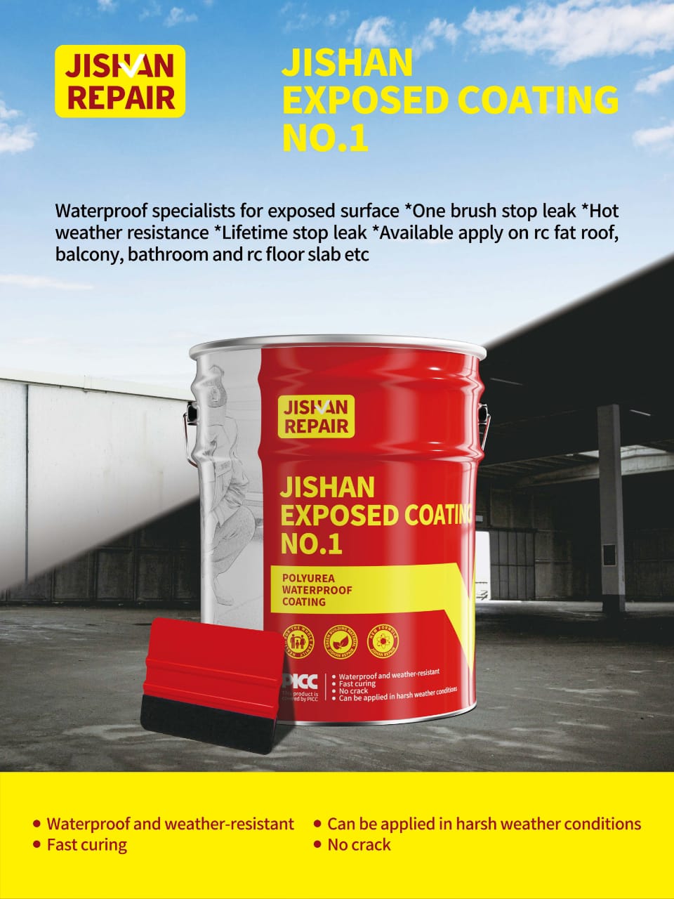 Jishan Exposed Coating No.1 是一种单组分防水涂料,以脂肪族异氰酸酯和氨基化合物为基础聚合物,配以填充促进剂和抗老化剂等多种添加剂生产而成。该产品采用特殊工艺生产,通过与空气中的水分发生反应而固化,形成具有硅氧硅三维结构的新型单组分湿固化防水涂料。作为一种环保、无味、无毒的优质防水涂料,该产品具有优异的户外耐老化性、长色牢度、光泽保持性,即使长期暴露在外也不会粉化。